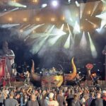 The elaborate stage setup included a pair of massive statues flanking a Viking helmet-shaped drum riser and a rear mural featuring a throng of warriors. That’s not to mention the several appearances of Viking warriors, who took part in a sword fight and waved flags, a stop from Loki, and singer Johan Hegg wielding a huge Thor-like hammer.
