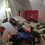 More debris was being removed Friday morning. The area where the car hit is covered with cardboard. Several bricks are protruding from the front of the building.