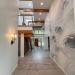 A custom wall mural in the entryway leads to soaring ceilings and kiln-dried, Western red cedar sourced from Washington state. Timber-framed post-beam construction features 360-degree glass views of the property and ample natural light.