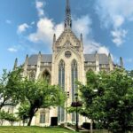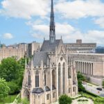 Dedicated in 1938, it has stone and wood carvings, a powerful pipe organ, and stained-glass windows created by Charles Connick. The stained-glass art depicts 391 people from history, literature, music and science as well as religious figures. The spire stretches 124 feet skyward from its base and reaches 256 feet above the ground.