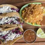 The street-style tacos (crunchy, fried shells) feature a protein of choice — ground beef, tinga chicken, grilled tofu, chorizo, wild shrimp, pork belly, al pastor, grilled salmon and more — topped with cilantro and onions. They’re served with rice and beans, verde and charred tomato salsa.