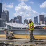 Eight crew members from Swank Construction could be seen — hard hats on and sweat dripping — working at 6 a.m. Tuesday in Downtown Pittsburgh.
