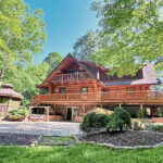 The custom three-story spruce log cabin home at 1255 Stitts Run Road on 2 acres along Carnahan Run Stream is listed for $525,000.