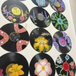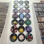 Twenty-one students painted vinyl records that are laid out in a grid at the entrance to CD Warehouse’s vinyl section.