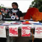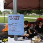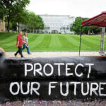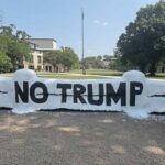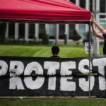 On the other side were the words “Protect the future,” “Protest the summit,” along with messaging urging people on campus to visit their red canopy tent to ask questions about an upcoming protest event and Trump’s participation at the summit.