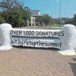 On Wednesday, students pitched a tent next to The Fence. Students also painted a new message that reads, “Protest The Summit,” along with “Protect Our Future” and “Come Talk To Us.” A canopy covering a picnic table was being used as an information desk about the summit and planned protest.