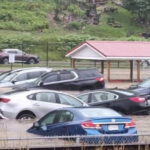 Once he waded back outside with his sister, Stallings turned around to capture video of the scene, where parked cars and a dumpster were floating through the school’s parking lot.