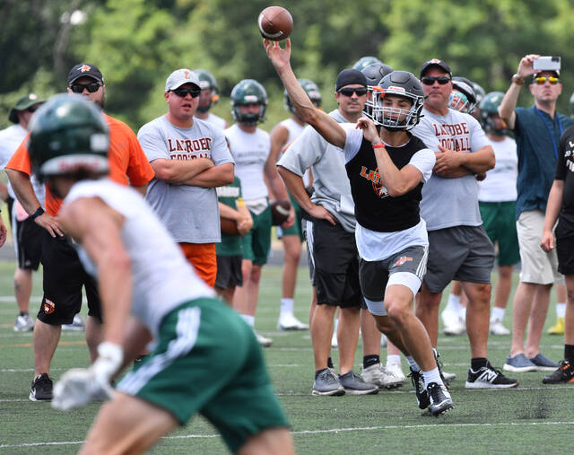 As Penn-Trafford’s final deep pass attempt sailed out of the end zone and fell incomplete, players from Latrobe jumped into each other’s arms and bounced around in a sudden swell of excitement. For once, the Wildcats got to celebrate on their home field, which hosted the county 7-on-7 passing tournament...